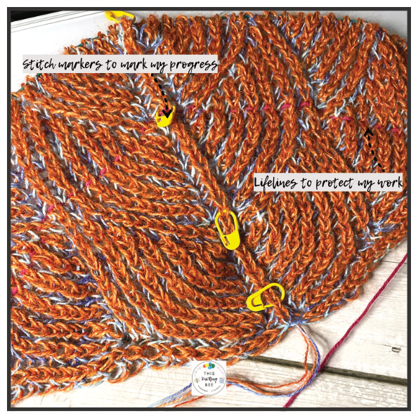 - Lifelines are imperative: I used a lifeline per pattern repeat. Threading them through all those stitches takes time, but it’s a stitch in time that saves nine (and endless frogging!).