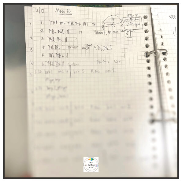 - Keeping track: I usually make notes to keep me on track, but with Miss B this step was not to be messed with. I had to write down where to increase and decrease, and I also kept a tally chart to monitor my progress in pattern repeats. Note: The photograph shows some sections blurred out to not give away the pattern.