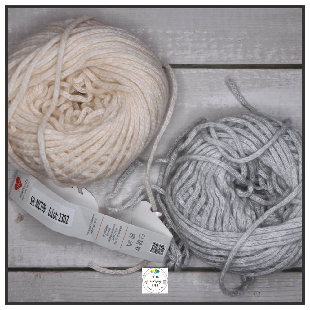 To best suit this hat’s requirements, I chose Heartbeat’s Oekotex Class I certified ‘Merino Cotton’ (https://www.heartbeatsyarns.com/product/merino-cotton). This is a medium worsted yarn, with a blend of 70% Cotton, 21% Merino Wool and 9% Alpaca. The meterage is about 100mtr per 50gm ball, which is just about the same as what West’s yarn has. There are about 14 colours available, of which I used two colours – white (MCT09) and grey (MCT05).